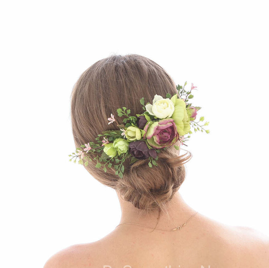 This Floral Wedding Hair Accessory is perfect to pop into the Back of your Hair on your wedding day. I used some pretty green false fern to which I added Ranunculus in pail green, ivory and two shades of burgundy along with some small pink flowers. Perfect for a bride or bridesmaid in garden or rustic wedding.
